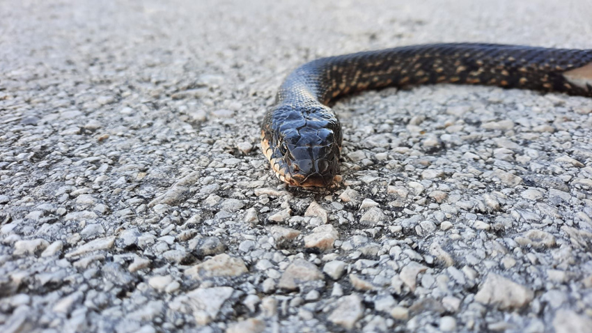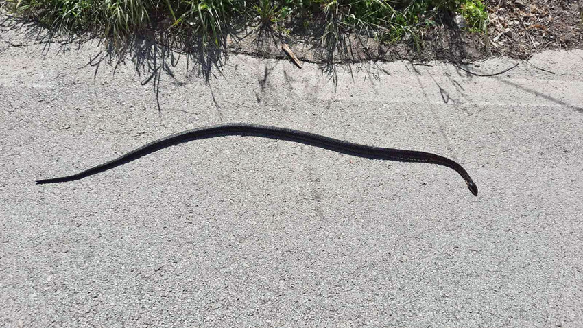 Leider war sie überfahren worden. Sie war ca. 1,75 m lang und ich tippe auf eine Hufeisennatter.
