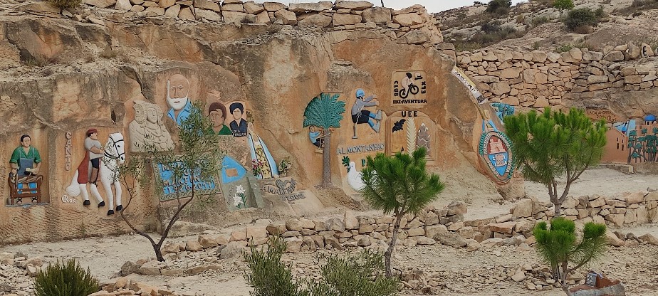 " El Cau" ist eine Gruppe von Skulpturen mit Motiven aus Elche, die in leuchtenden Farben direkt in den Sandsteinfelsen gemeißelt wurden. Der Schöpfer dieser Pracht war Mariano Ros, der 2017 im Alter von 91 Jahren verstarb. Gemeinsam mit einigen Kollegen schuf er seine ersten Arbeiten im Castellar-Gebirge aber wegen der dortigen Schutzbedingungen ( Überreste der ersten islamischen Siedlung befinden sich dort) wurden die Skulpturen an den heutigen Standort verlegt. Bis 2008 setzten Ros und seine Kollegen die Arbeiten fort, bis sie gezwungen wurden, die Arbeiten wieder einzustellen, weil sie auf öffentlichem Grund stattfanden.
