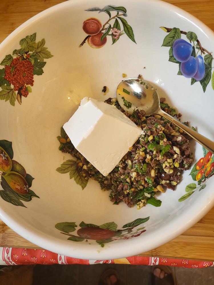 Die Pinienkerne in Olivenöl rundherum goldbraun rösten, herausnehmen, etwas abkühlen lassen und fein hacken. Die Oliven mit einem großen schweren Messer fast musig hacken. Die Basilikumblätter abzupfen, den Knoblauch schälen. Beides mit dem Zitronenschalenstück sehr fein hacken. Oliven, Basilikummischung, Ziegenfrischkäse und Pinienkerne gründlich verrühren und mit Salz, Pfeffer und dem Honig kräftig abschmecken.