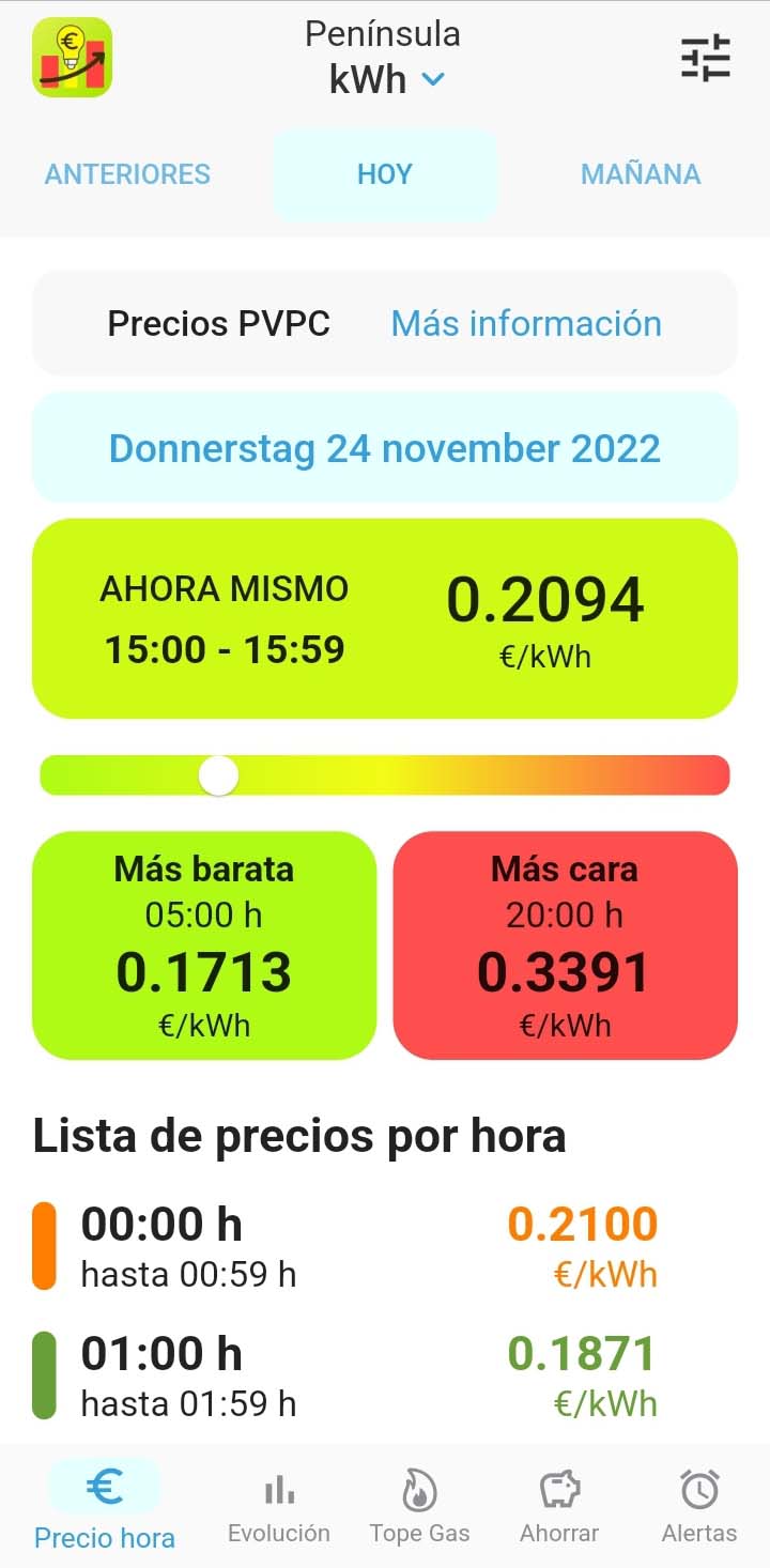 Ich bin im GooglePlay auf eine App gestoßen, die sich "Precio Luz España" nennt und angeblich den