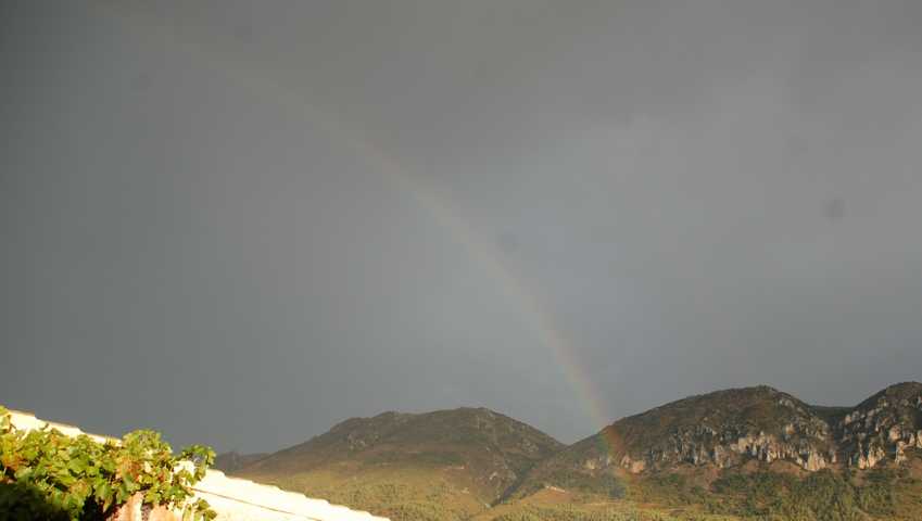 Lt. Kalender beginnt der Herbst erst am 23. September, doch nach einem heißen August sieht es so aus, als hätte er gestern bereits begonnen. Wir sind an der Küste bei 28 Grad abgefahren und fuhren gen Westen in eine dunkle Wolke hinein. In Jalón regnete es bereits und die Temperatur ging schlagartig auf 17 Grad herunter und veränderte sich nicht mehr, bis wir zu Hause ankamen. Nach dem erfrischenden Regenguss, zeigte sich abends wieder die Sonne und präsentierte einen Regenbogen.
