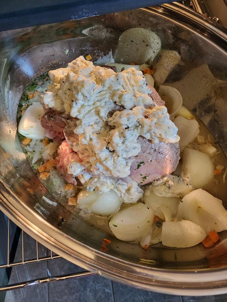 Roquefort mit 200 g Creme Fraiche glattrühren. Die Keule nach 10 Minuten so drehen, daß die gewölbte Seite nach unten liegt, dann mit der Käsecreme bestreichen...