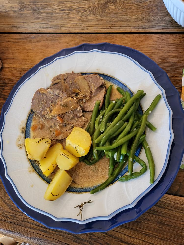 Dazu gab es Rosmarinkartoffeln und Prinzessbohnen (die waren mit etwas Butter und Knoblauch