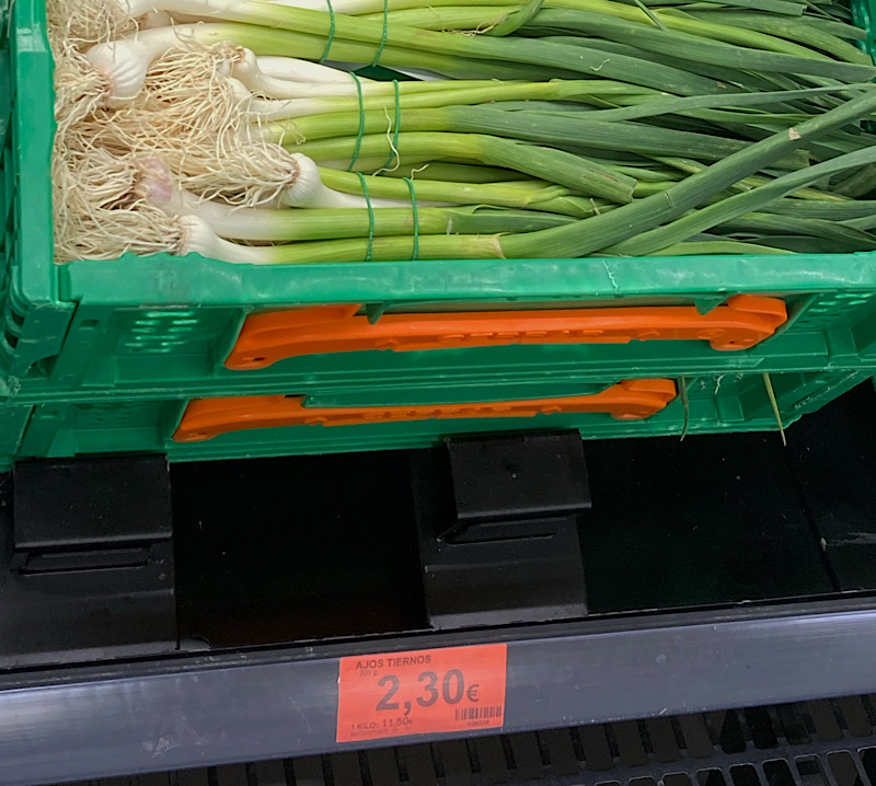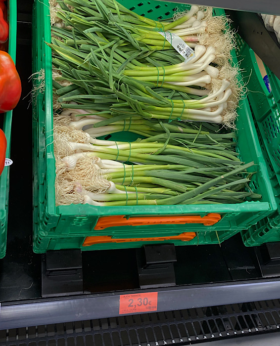 Lauchzwiebeln sind cebollas tiernas und kosten bei Mercadona 1,24.