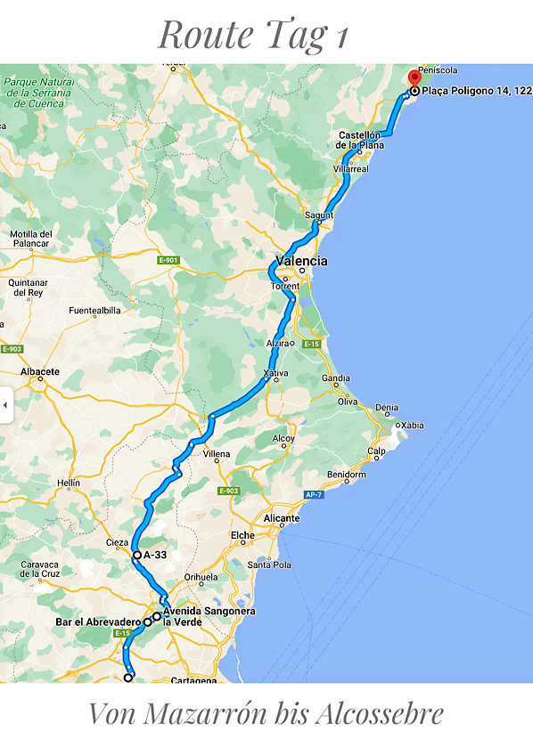 Nach einem letzten Frühstück am Samstag morgen in unserer Lieblingsbar tanken wir ein letztes Mal bei Murcia den preisgünstigen Diesel (1,39 €/L) und starten von dort zum ersten Ziel in der Provinz Castellón.