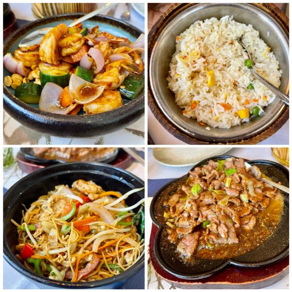 Die Hauptspeisen - Gambas aus dem Wok und Kalbfleisch vom Grill - wurden zusammen mit Reis und asiatischen Nudeln - beides sehr lecker zubereitet - gereicht.
