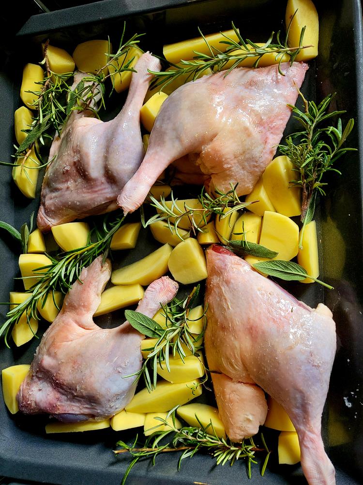 Die geviertelten Kartoffeln ebenso auf das Blech um die Ententeile herumlegen. Rosmarin und Salbei dazulegen.