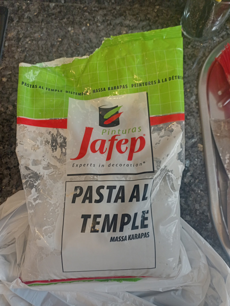 Wir wussten Anfangs nicht, was genau das für ein Material an der Wand ist. Bis wir einen Tipp bekamen: Das ist "Gotelé" sagte jemand. Im Baumarkt wird man fündig - den Putz (laut @baufred auf Gipsbasis) gibt es in verschiedenen Größen fertig angerührt in Plastebeuteln, klein (1 Kg) bis groß (5 Kg) und nicht teuer (einstellig). Die Pasta al Temple oder Gotelé (spanisch für "Tröpfchen")-Masse ist recht dickflüssig. Man gebe davon einen Batzen in ein geeignetes Gefäß, beispielsweise so: Dann sollte man es mit etwas Wasser verdünnen, dabei schön mit dem Spachtel rühren. Nicht zu wenig Wasser ("Pudding") und nicht zu viel Wasser ("Sahne"). Ganz nach individueller Präferenz und vorhandener Tröpfchengröße. Dann sieht es so aus: Jetzt kommt der spannende Teil. Den man sich auf verschiedenen Youtube-Videos anschauen kann. Die Standard-Technik ist: einen größeren Kleks auf eine Kelle geben und mit den roten Spezial-Plaste-Pinsel (siehe oben) schnell über den Rand in Richtung Wand wischen. Die so an die Wand fliegenden Tropfen bleiben hoffentlich dekorativ hängen. Ich habe das nicht hinbekommen und es ist sowieso eine Riesensauerei. Ich bin daher auf "Tupfen" ausgewichen: den Plaste-Pinsel etwas in die Pasta eintauchen und dann schön schnell an die Wand tupfen. Damit bekommt auch größere Dinge "Eingegipst" bzw. "Spanisch weggemogelt", z.B. diese vom Elektriker aufgemachte Verteilerdose Sieht anschließend vor dem Überstreichen mit Wandfarbe so aus (und entwickelt einen eigentümlichen aber nicht unangenehmen Geruch): Natürlich bekommt man bei der Prozedur weiße Finger. Und ganz sicher landen Spritzer an unvorhergesehenen Stellen. Das lässt sich aber mit Wasser und ggf. einen Glitzi-Schwamm o.ä beheben. Richtig gerade und akkurat bekommt man das beim Renoverien nicht hin, man sollte also mit einer guten 80% Lösung zufrieden sein können. Oder man sucht sich einen dieser spanischen Bauleute mit viel Erfahrung und Fingerspitzengefühl für diesen Job.