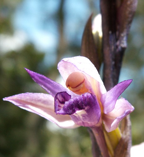 Der violette Dingel besitzt kaum Blattgrün und ist komplett violet gefärbt. Er wächst auf kalkigem Boden und vor allem in Südlichen Ländern. In Mitteleuropa kommt er höchstens in Weinbauklima vor und ist infolge des geringem Vorkommen bereits stark gefährdet. In Spanien trifft man ihn aber schon noch an, so fern man ihn im lichten, trockenen Pinienwald und lichten Gebüschen überhaupt entdeckt. Der violette Dingel blüht vorwiegend im Juni und sein Blütenstängel wird bis zu 80 Zentimeter hoch, eben wie "meiner". Die Blüten können gemäss Orchisliteratur einen Durchmesser bis zu 4 Zentimeter erreichen. Was bei meinem Exemplar in Etwa höchstens drei Zentimeter war und möglicherweise mit der grossen Anzahl Blüten in Zusammenhang steht. Dies ist aber nicht bewiesen.