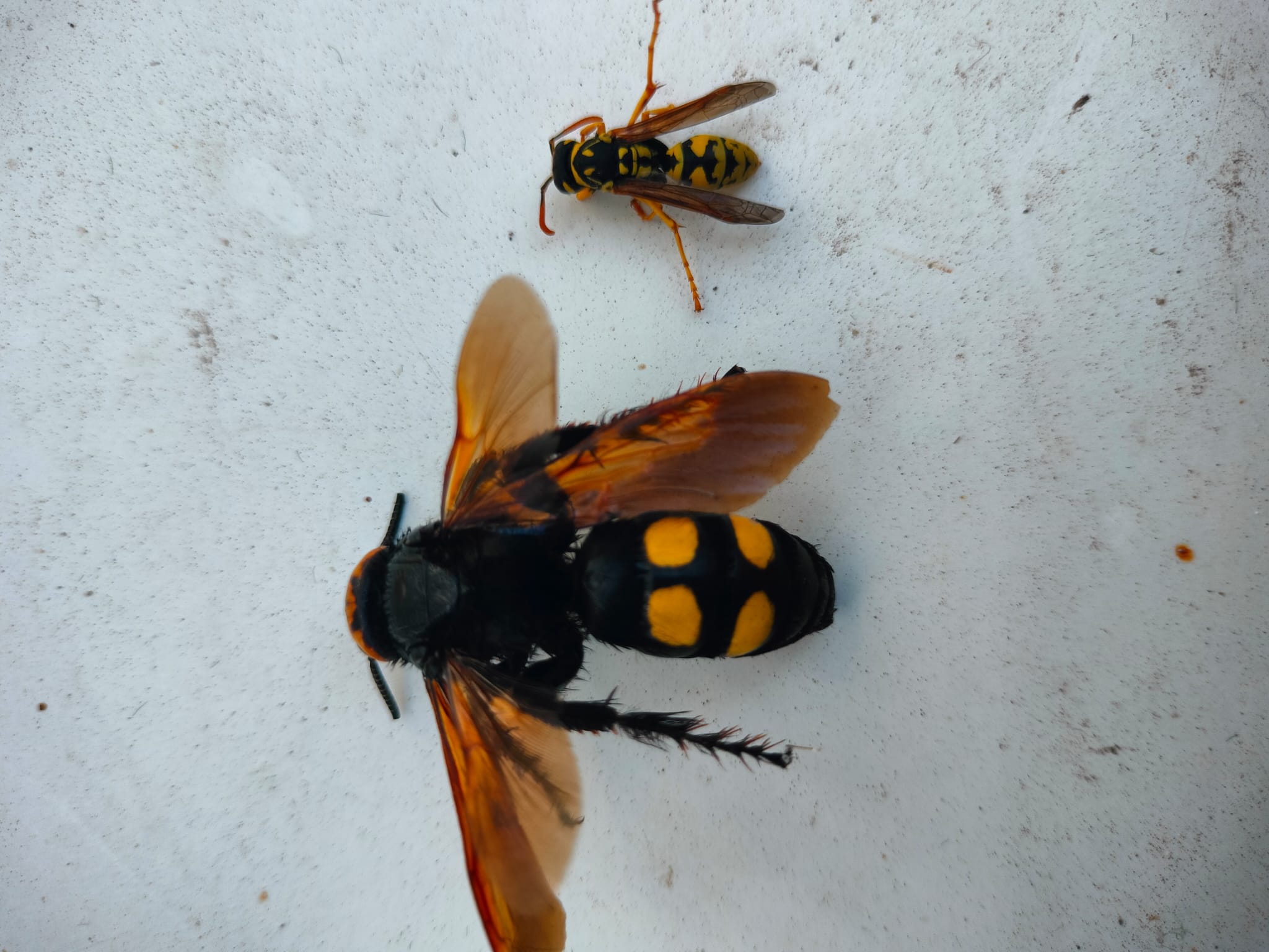 Die Antwort war beruhigend: Bei der furchterregend ausschauenden Wespe handelte es sich um eine Dolch- oder Mammutwespe. Die Megascolia maculata flavifrons ist die größte Wespenart Europas und die zweitgrößte Wespenart der Welt. Sie hat eine einheitliche schwarze Farbe, die durch vier gelbe Flecken auf dem Hinterleib unterbrochen wird, und dunkle Flügel hat (deshalb auch die Bezeichnung Vierpunktwespe), während die asiatische Wespe bernsteinfarbene Flügel hat und ihr Hinterleib, der dunkel ist, mehrere gelbe oder orangefarbene Streifen aufweist.