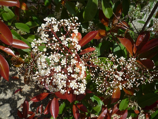 Auch meine Glanzmispel (Photinia `Red Robin`) blüht mit weißen Dolden.