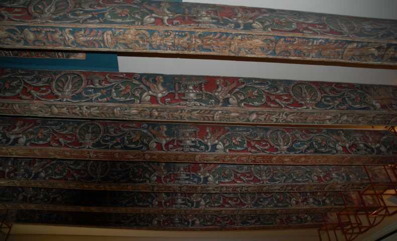 - Bemalte Deckenbalken - Im Königreich Valencia erreichte die Herstellung von Fliesen und der sogenannten “Socarrats“ (künstlerisch gestaltete Kachelbilder) oder dekorativer Deckenplatten ein beachtliches Qualitäts- und Produktionsniveau in Paterna, Manises, Quart und Mislata.