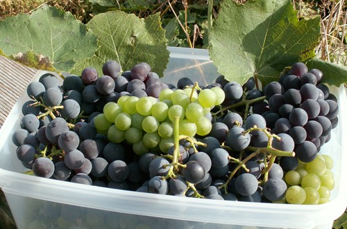 Ich habe keine Spindelpresse und gebe die Trauben deshalb in einen Entsafter. Der Saft ist dann zwar ziemlich trübe und enthält viel Fruchtfleisch, da ich ihn nicht filtere, aber er schmeckt trotzdem gut. Bei mir hängen noch ziemlich viele Trauben an den Stöcken, obwohl wir schon seit August ununterbrochen davon essen. Inzwischen holen sich Vögel und Insekten ihren Anteil, aber sie lassen uns immer noch genug übrig, so dass wir wohl noch ein Weichen davon essen können. Gestern hat es ordentlich gestürmt und der Wind hat einen großen Teil der Weinblätter runtergefegt.