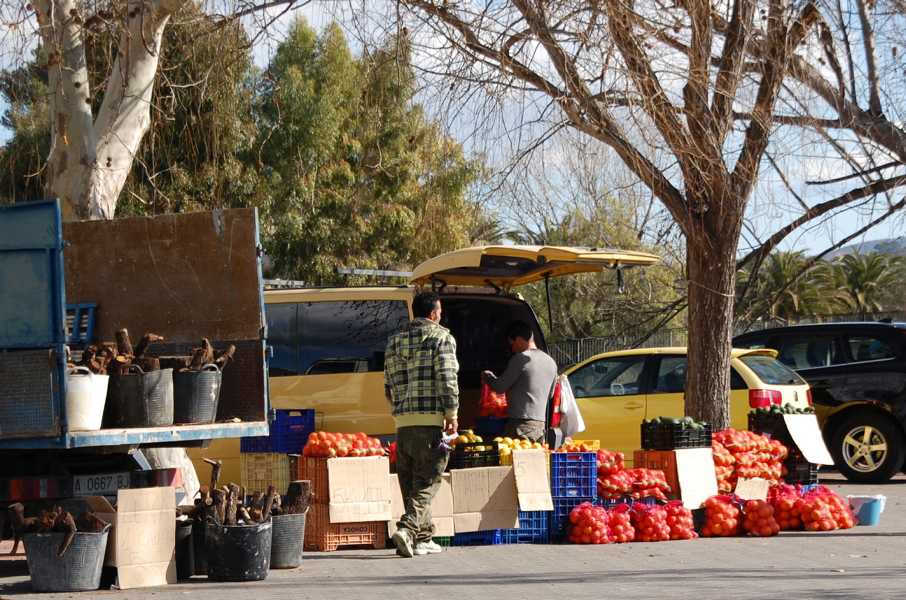 Auf dem Platz vor der Bodega in Jalón (Marina Alta) stehen täglich Obst- und Gemüsebauern, die ihre Produkte verkaufen.