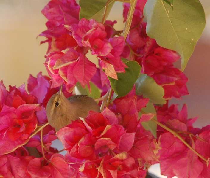 Schaut mal, der kleine Piepmatz hat sich heute über unsere Bougainvillea hergemacht.