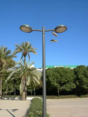 Verrückte Welt. Das gefällt mir. Das waren bestimmt Spanierinnen, die die Schuhe in die Laterne bzw. den Baum geworfen haben.