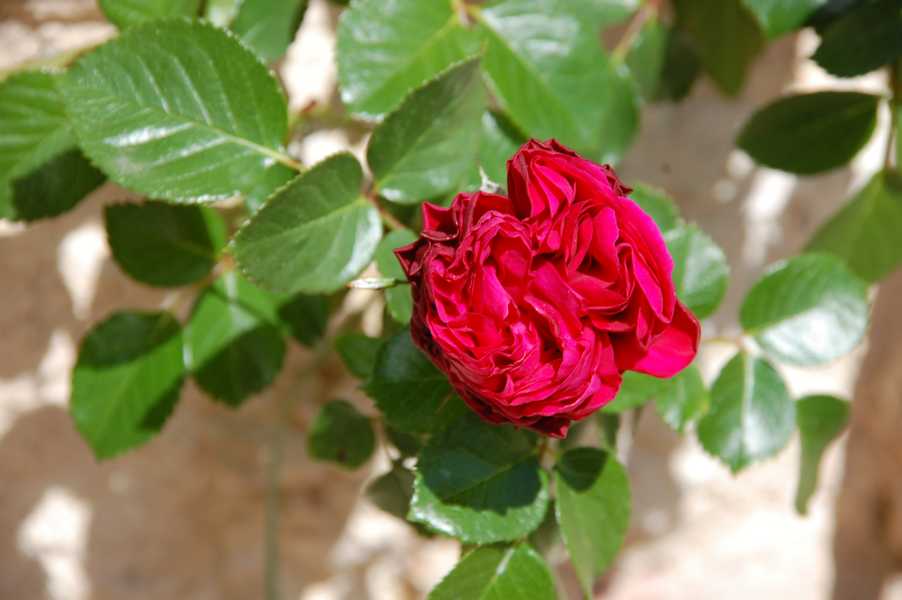 Die Blüten der Red Eden Rose erinnern an alte Rosen: sie sind purpurrot, duften nach Moschus - besonders in der Mittagszeit. Die Rose ist winterhart (bis 29 ° C) und blüht in Spanien ab April bis zum Einsetzen des Frostes (in Mitteleuropa). Bei mir im Hinterland hat sie im Winter nur kurzzeitig alle Blätter verloren.