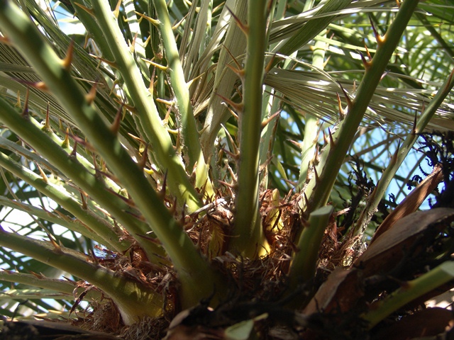 Was da auf dem ersten Foto vertrocknet aus dem Herz der Palme herauskommt, ist jedoch kein vertrockneter Palmenwedel sondern eher ein alter Blüten- bzw. Fruchtstand zu sein. Der wird braunn und trocken, wenn er nach Abfallen der Früchte nicht rausgeschnitten wird - ist also völlig normal.
