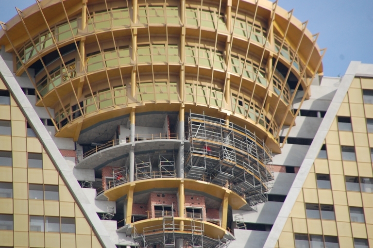 Obwohl, dieser Klotz hat schon etwas Gewaltiges, das "höchste Hochhaus" mit seinen 200 Metern. Noch immer wird daran geschraubt und gewerkelt, überall Baulärm, es wird gebohrt und gehämmert, was das Zeug hält. Der "Rohdiamant" , der bedrohlich in der Mitte hängt, muss wohl noch geschliffen werden, er ist teilweise immer noch im Rohbau.