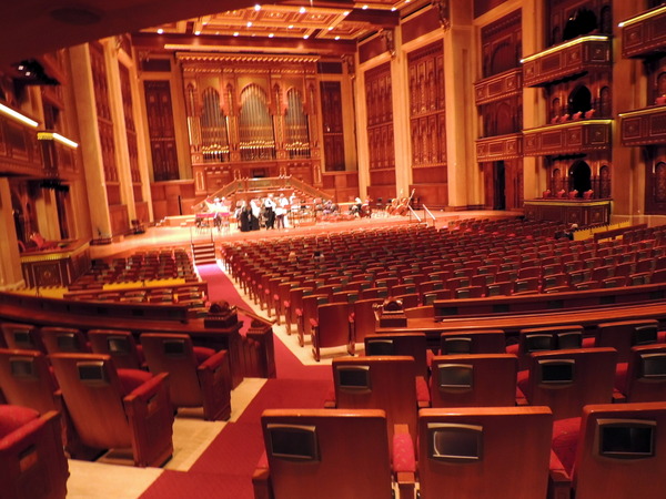 Ein Besuch des Theatersaals war nicht vorgesehen, weil dieser wegen Konzertproben für Publikum geschlossen und nicht zugängig war, für Einhaltung dieses Verbots sorgte ein überaus erst dreinblickender Sicherheitsdienst. Deshalb sollten wir nur den Vorraum betreten, aber dort traf unsere Führerin auf den ihr persönlich bekannten ersten Geiger, stellte unsere Gruppe vor und bat ihn mit weiblicher Finesse, ob wir nicht wenigstens einen Blick in den Saal werfen dürften. Der Konzertmeister konnte nicht widerstehen und ließ seinerseits nachfragen, ob wir nicht vielleicht doch ... und wir durften! Ganz leise, keine Fotos bitte und nur ganz kurz ... aber die Proben pausierten gerade und so konnten wir auch ganz schnell für ein paar wenige Bilder unsere Kameras zücken: