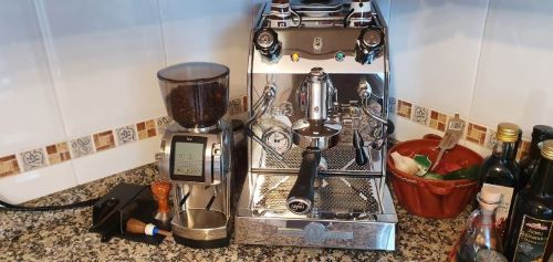 So sieht mein Equipment aus (eine Bezzera Magica mit Quamar Mühle), Kostenpunkt mit Zubehör ca. € 2.000,- Ist allerdings ne Anschaffung für´s Leben. Der Kaffee ist toll, aber nicht so gut - wie die Maschine teuer - im Nachhinein betrachtet. Aber man gönnt sich ja öfter mal unvernünftiges im Leben.