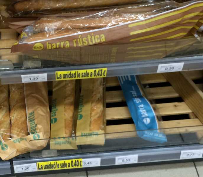 Nachtrag Moni: beim belgischen Bäcker an der Playa Flamenca gibt es französisches Baguette um € 0,75, beim Alcampo kostet das billigste barra ebenfalls € 0,45