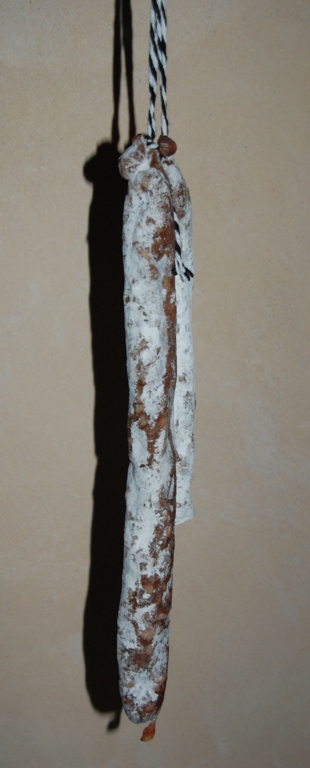 besteht zu 70 % aus Schweinefett, 30 % aus gehacktem, mageren Schweinefleisch, feinem Salz, Rosenpaprika, weißem gemahlenem Pfeffer, gemahlenen Nelken und Wasser. Nach 24 Stunden wird der Wurstbrei in Därme gefüllt und trocknet 15 bis 20 Tage.