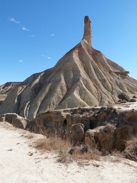 Nach einem ausgiebigen Frühstück fahren wir Richtung Norden und schwenken damit nach Navarra. Heute ist der totale Gegensatz angesagt: die 42 500 ha große Halbwüste Bardenas Reales. Der Zufahrtsweg bei Tudela zweigt an einer Tankstelle an der Ausfahrt Arguedas ab und führt zu einem Informationscenter, wo man sich einen Plan mit den ausgeschilderten Wegen holen kann (für Radfahrer und Wanderer gibt es extra Wege). Diese wunderschöne wilde Naturlandschaft wurde von der UNESCO zum Biosphärenreservat erklärt. Erosion des Lehm-, Kalk- und Sandboden hat eine Mondlandschaft voller Schluchten, Hochebenen und vereinzelte Hügel gezaubert. Bei Regen ist eine Durchfahrt mit normalem PKW verboten. An ausreichend Wasser sollte man denken (kein Kiosk in der Nähe