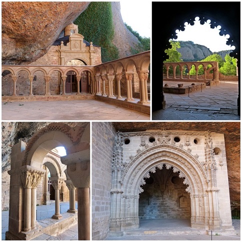 In Burgui deckten wir uns mit Brot, Schinken, Käse und Wein ein und machten ein leckeres Picknick in Roncal. Die gepflegten Häuser waren blumengeschmückt, fast wie in der Schweiz oder Österreich. Die röhrenden Ferraris weckten uns aus den Träumen und so zogen wir ins Nachbartal. Das Anso-Tal ist noch wilder, ein gurgelnder Bach und eine schmale Strasse, auf beiden Seiten senkrechte Wände oder auch Überhänge, das ist die Foz de Biniés Die Strasse ist wenig befahren, und so können wir die Riesenvögel wunderbar beobachten. Noch durch ein paar Felsbögen, dann wird die Landschaft wieder lieblicher. Da wir noch nicht ins Hotel bei Jaca wollen, fahren wir noch zum Monasterio de San Juan de la Pena