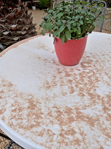 Ich bin ran mit dem Hochdruckreiniger, natürlich entweder mit größerem Abstand oder mit reduziertem Druck, läßt sich alles wunderbar reinigen auch die Balustraden und Fliesen. Oder man wartet bis zum nächsten Regen!