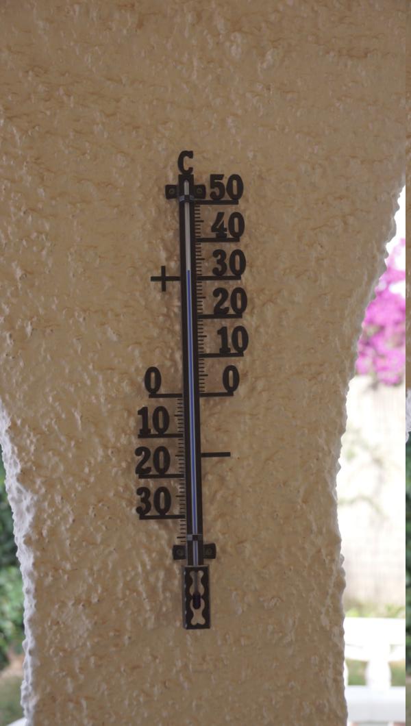Jetzt 25,2 ° ( heute mittag 32,4 °) Luftfeuchte zum Glück wenigstens 78 %, Wind 3 Bft aus Süd ruhiges Meer, leicht diesig, Barometer gleichbleibend.