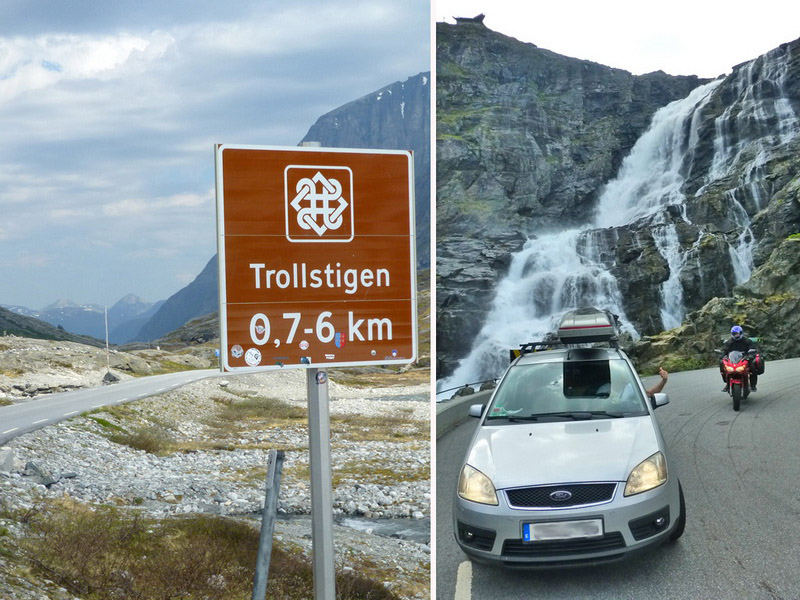 Irgendwann erreichen wir einen großen Parkplatz, wo man auf der ca. 700 m hoch gelegenen Passhöhe eine schöne Aussicht hat und ggf. in der Trollstigen Fjellstue einkehren kann. Hier beginnt der Abstieg über die Panoramastraße Trollstigen, eine spektakuläre Bergstrecke. Sie senkt sich in 11 Serpentinen hinunter zum Romsdals-Fjord und führt direkt an einem tosenden Wasserfall vorbei.