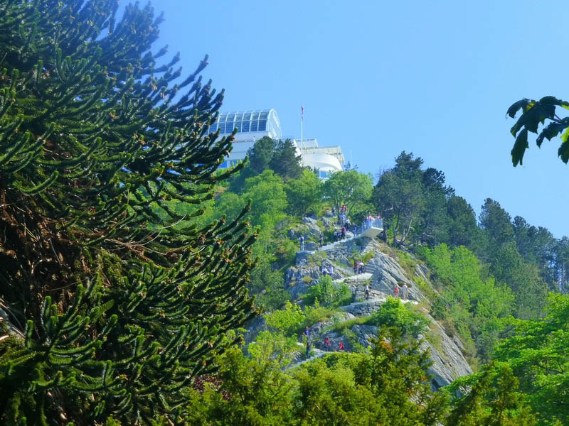 Auf den Hausberg Fjellstua kommt man durch einen kleinen Park und dann über 418 Stufen, die wir in praller Sonne hinter uns bringen.
