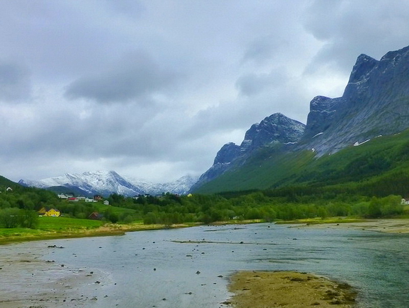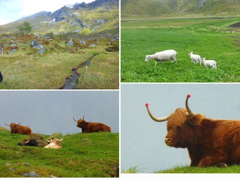 Wir setzen die Erkundungstour fort. Die Entfernungen halten sich in Grenzen, wie man aus der Karte ersehen kann. Natürlich halten wir an jeder Ecke, an der sich eine schöne Aussicht oder etwas Sehenswertes bietet. Einige Stichsträßchen führen zu kleinen Ansiedlungen, und es öffnen sich immer wieder neue Blicke auf schroffe Berge mit alpinem Charakter und zum Teil verschneiten Kuppen, auf satt moosgrüne Hänge, dann und wann leuchtend rote Dächer einsamer Häuser oder Hütten. Die folgenden Bilder sind nicht mehr chronologisch geordnet. Sie sollen Eindrücke dieser ganz besonderen Landschaft vermitteln.
