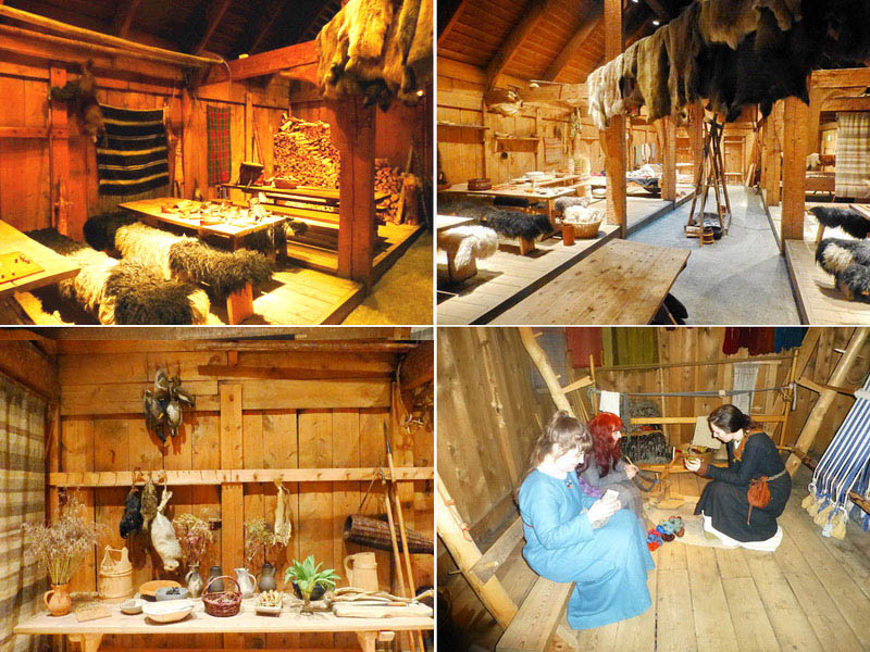 Wieder zurück beim Langhaus, schauen wir uns dessen Räume an. Es gibt zwei Eingänge. Der eine führt zum Bankettsaal, zu der dahinter liegenden Küche und weiter zu Stallungen. Durch den anderen Eingang kommt man zu den Wohnräumen, Im Bankettsaal wird auf Wikingerart im Eisenkessel über offenem Feuer gekocht. Nebenan sind Schmuck und Gebrauchsgegenstände ausgestellt, man kann das Spinnen und Weben beobachten, und es gibt Vorführungen zur Herstellung von Schuhen.