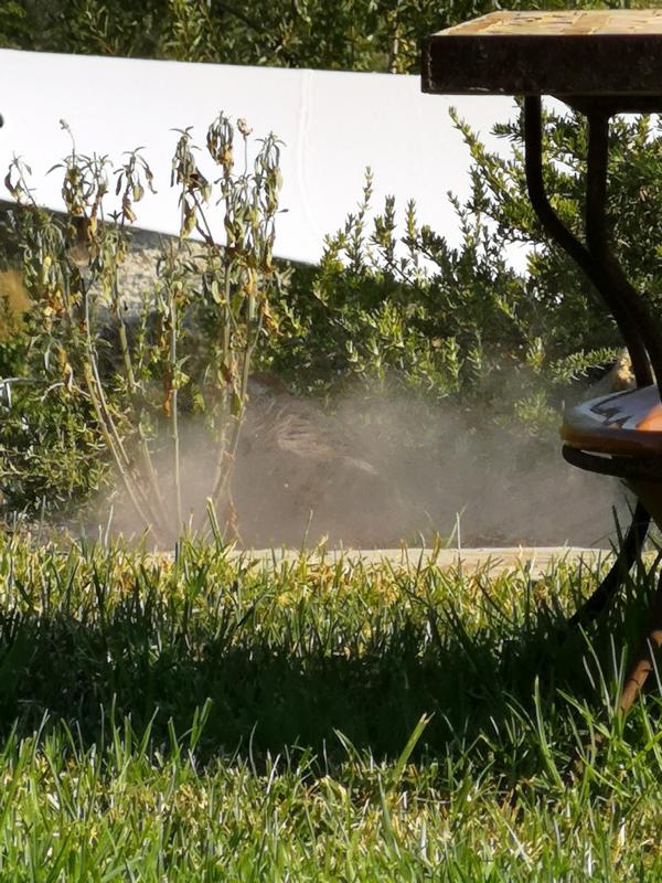 Ein Trost: Heute morgen hat er uns wieder besucht, Olivo konnte gerade noch seine Schwanzfedern (Atze kennt sicher den Fachausdruck) in Richtung Parkplatz ausmachen.
