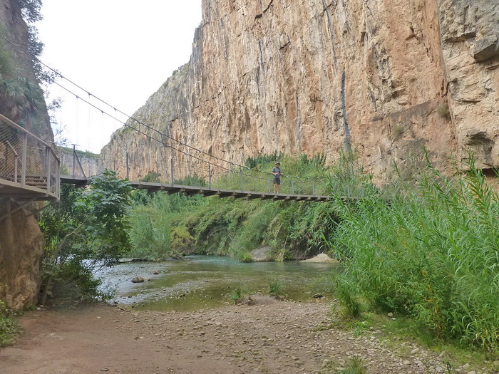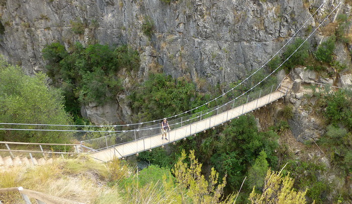 An dieser Stelle wuchert das Grün rund um das Flussbett besonders heftig, und es begleitet die Wanderer auch im weiteren Verlauf bis zum Erreichen des Stausees. Zweimal muss man die Seite wechseln. Die Hängebrücken sind grundsolide, die Schlucht zwischen den senkrecht nach oben ragenden Felswänden äußerst beeindruckend !