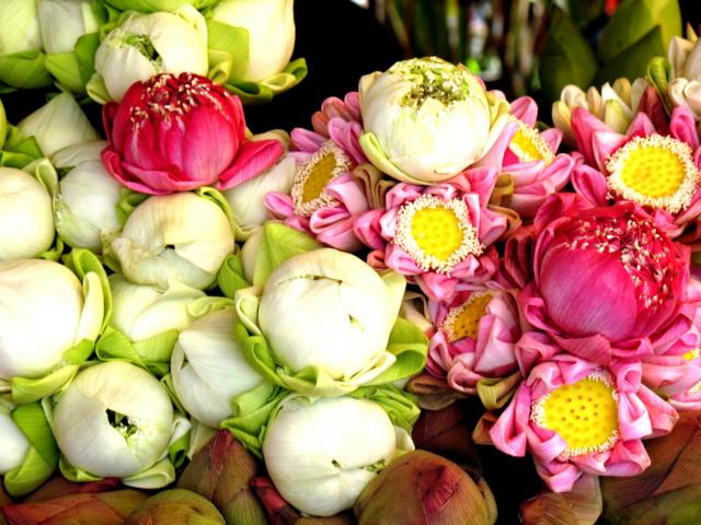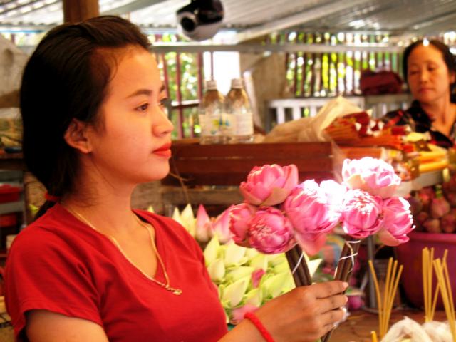 Am "Royal Garden" an der Königlichen Residenz, verkaufen junge Frauen Blumen. wie hier die Shorea robusta Blumen(Blüten des Salbaums. Nach einer Sage gebar unter einem Salbaum die Königin Maya ihren Sohn Siddhartha Gautama, der später durch seine Erleuchtung zum Buddha wurde.