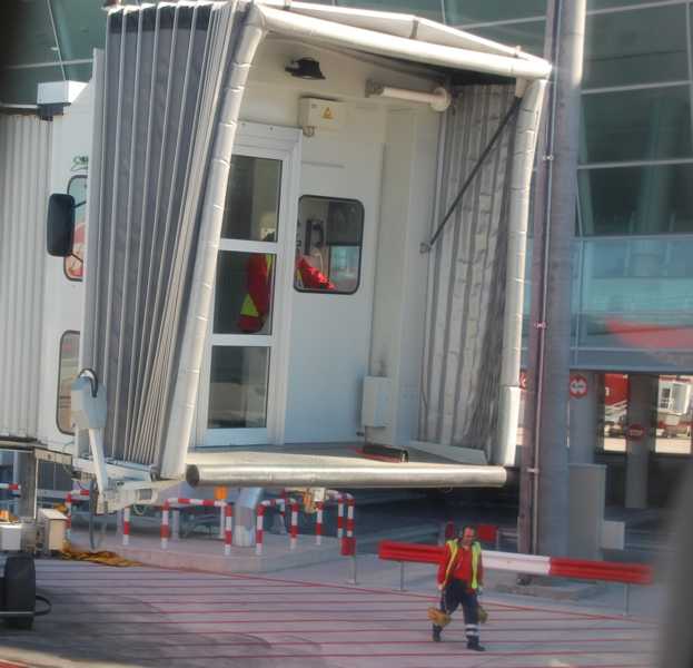 - Die Brücke wird von einem Flughafenangestellten, dem so genannten Brückenfahrer, bedient, der sie mit einem Joystick und häufig elektronischer Bedienhilfe an die Tür des Flugzeugs andockt. Die meisten Brücken sind dreidimensional beweglich auf einem drehbaren und in der Höhe verstellbaren Fahrwerk gelagert.