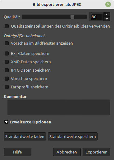 - Klickt man jetzt auf [Exportieren], dann öffnet sich ein zweiter Dialog. Hier alle Options-Kästchen ausschalten (braucht man nicht, will man nicht im Forum). Die Qualität herunter drehen, 80% sind völlig ausreichend.