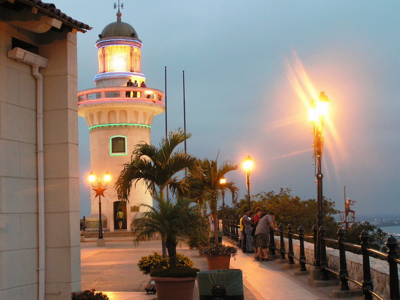 Kurz vor dem Eindunkeln wenden wir uns dem nördlichen Ende des Malecon zu. Ein Aufgang mit und 400 Stufen und kleine Wege führen zwischen den alten, kleinen Holzbauten hinauf zur Hügelkuppe Cerro Santa Ana mit einem Leuchtturm und einer kleinen Kapelle.
