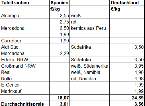 - In Spanien lagen die Preise für 1 kg Tafeltrauben beim Discounter zwischen 1,98 und 2,09 €/kg, Aldi in Dénia war mit 3,18 €/kg der Ausreißer unter den Billiganbietern.