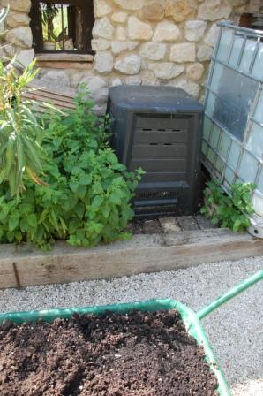 Der Standort meines Komposters ist ideal. Er steht auf Lehmboden, schattig an der Nordseite einer Mauer, auf seiner linken Seite hat sich Zitronenmelisse selbst ausgesät und fühlt sich seiner Nähe offensichtlich pudelwohl, da ich sie ab und zu stutzen muss, weil sie sich so rasant ausbreitet; rechts steht äußerst praktisch ein Plastikbehälter mit 1.000 l Wasser, das ich nutze, um in unregelmäßigen Abständen (alle paar Wochen) einen Eimer davon über den Kompost zu gießen.