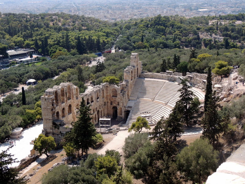 Die Außenfassade des antiken Theaters ist im Prinzip das erste Bauwerk, welches man von Nahem sieht bevor man die Akropolis betritt. Vom Akropolishügel hat man einen phantastischen und überaus beeindruckenden Blick über das gesamte Stadtgebiet von Athen.