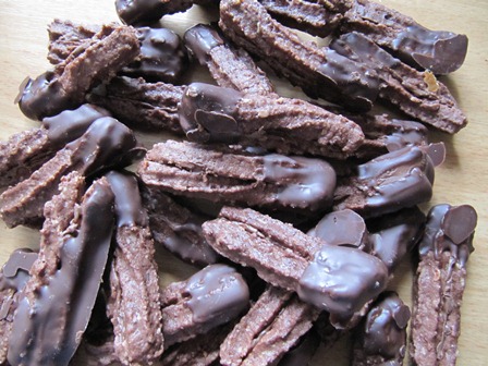 Ganz weiche Butter mit Puderzucker schaumig schlagen, Mehl durchsieben, dann zur Masse langsam dazugeben und Zitronenschale (gerieben) und Kakaopulver dazugeben.