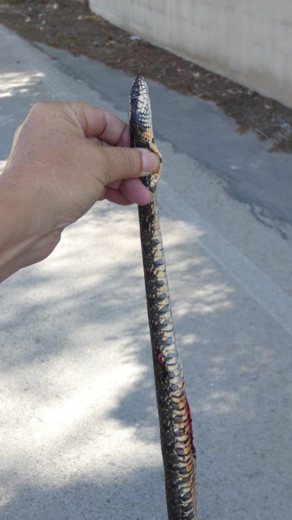 Leider war sie überfahren worden. Sie war ca. 1,75 m lang und ich tippe auf eine Hufeisennatter.