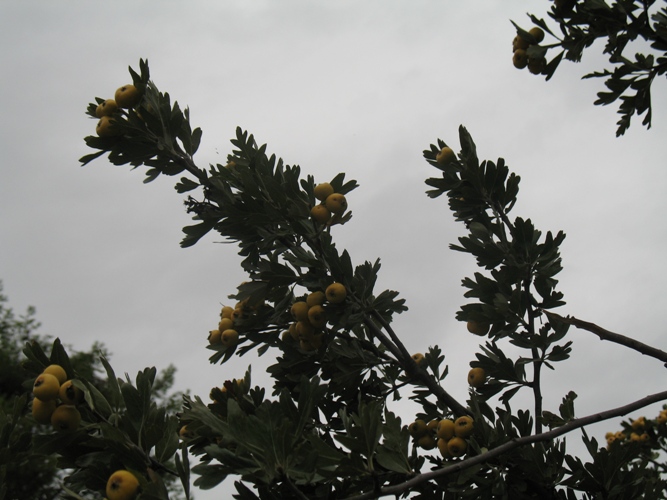 In unserer Gegend wachsen Weißdorne (wissenschaftlicher Name Crataegus), deren Büsche bzw. kleine Bäume zurzeit gelbe Früchte tragen.