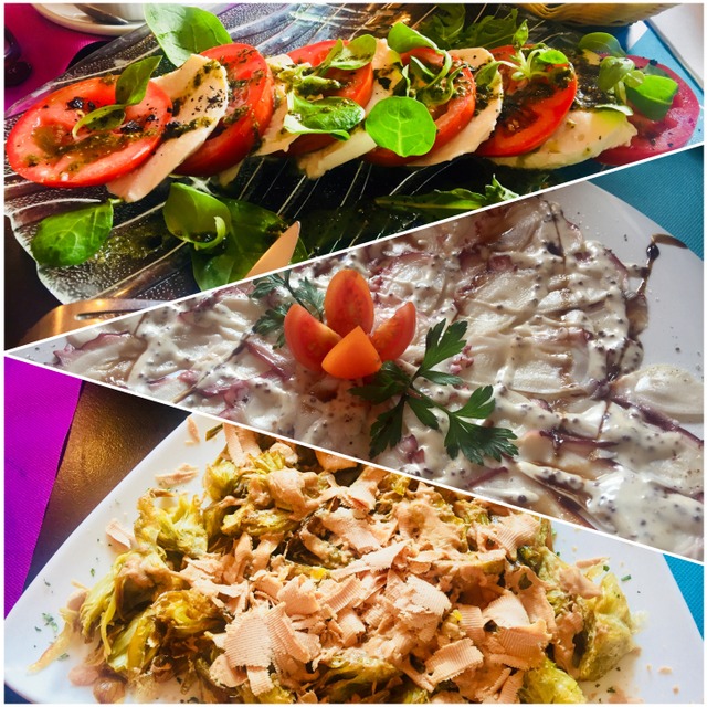Zu Beginn erhält man drei verschiedene Vorspeisen sowie Brot und Alioli.