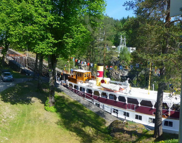 Beim Telemarkkanal wollen wir uns eine alte Schiffs-Hebeschleuse ansehen: Vrangfoss. Sie überwindet mit Hilfe von fünf separaten Schleusenkammern eine Höhe von 23 Metern.