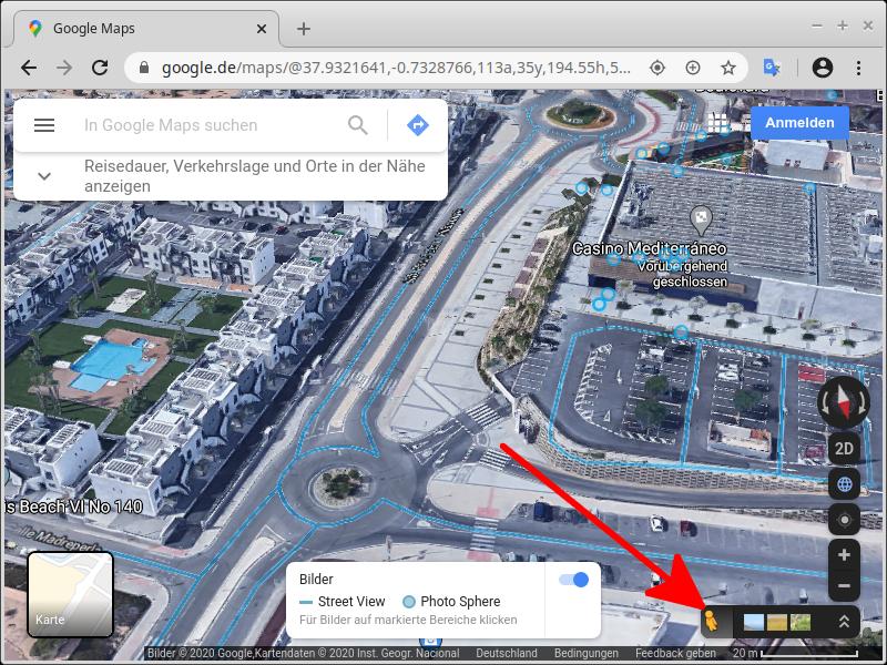Dazu den Mauszeiger über der Miniatur-Karte unten links schweben lassen. Jetzt kann man das gelbe Männchen neu platzieren: einfach auf eine blaue Linie klicken. Besonders praktisch ist das in der zweigeteilten Ansicht: dazu das Maximieren Symbol anklicken.